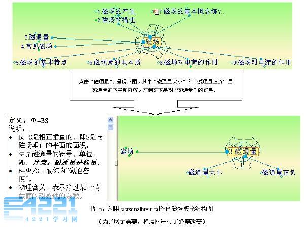 由于实现思维导图的软件操作简单,所以学生非常容易掌握。对于有些内容我们会让学生自己动手,根据自己对知识的理解,构造概念图。如图5所示的是学生在学习完磁场一章内容之后总结的知识结构图,在这里不仅列出了各个知识点,而且每一部分都在相应的文本区中写出了对该知识的理解。
