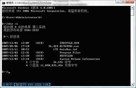 开始菜单-运行-输入“cmd”来到cmd界面,输入“D:” 跳转到D盘根目录,因为AV是不感染C盘根目录的,再输入“dir /a”显示D盘根目录内的所有文件及文件夹。“/a”这个参数就是显示所有文件,包含隐藏文件。如图: