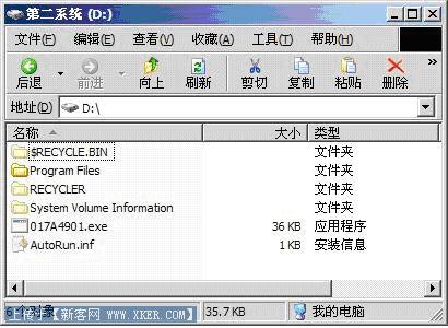 我们看到D盘内多出了Autorun.inf以及随机生成的病毒文件017a4901.exe。我们一起看看Autorun.inf的内容,输入”type autorun.inf”,Autorun.inf里的代码的意思就是当你双击打开、右键打开、资源管理器打开。都会自动运行目录里的 017A4901.exe这个文件。所以对于普通用户来说,即使你听过别人劝告,通过右键打开企图避免运行病毒也是徒劳的。因为“上有政策下有对策”,病毒也是在不断的变种升级的!当然它并不是无敌的,下文中我们就会讲述如何清理它。