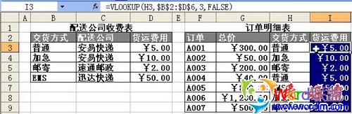 有时候,我们需要精益求精。在下面这个“订单明细表”(见图3)中,最后一列“货运费用”中的数据要通过“交货方式”从左侧“配送公司收费表”中进行匹配查询。这是一个典型的精确查询的例子,计算第1个数据的函数公式是“=VLOOKUP(H3,$B$2:$D$6,3,FALSE)”。