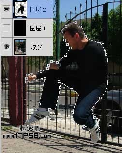 1、首先打开一幅功夫帅哥图片(点击打开)用钢笔抠出主体人物,转为选区,ctrl+J复制选区到新层,底部新建图层1,填充黑色。