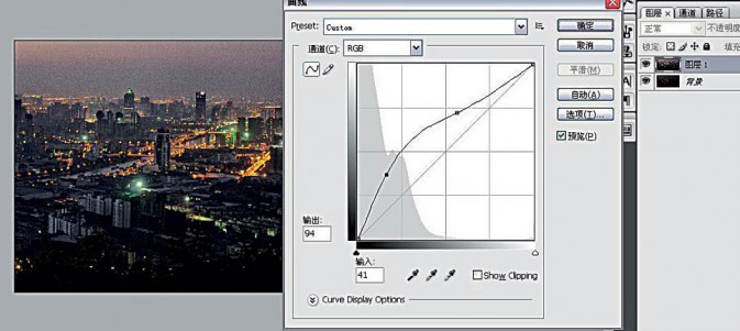 | 2、接下来我们对画面的整体色调进行调整。原作品的曝光不足,没有我们想要的灯火通明的效果,因此我们要对曝光进行调整。调整的方法有很多,我们这里使用曲线工具进行调整。 |