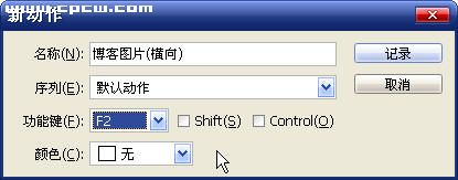 3.在“新动作”面板里为你的动作设置名称和快捷键。本例中动作名称为“博客图片(横向)”,快捷键为“F2”。然后点击“记录”按钮,“动作”面板下边的 “开始记录” 圆形按钮将变成红色按下状态,PS将记录下你的每个动作设置。 |