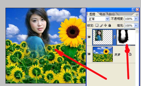 点箭头所指按钮,在MM层出现了一个蒙版图标,而且这个图标是显示被编辑状态,现在的操作就是在蒙版上进行了。我们试着把MM融到花丛里: 首先选黑色画笔,涂抹我们想隐去的部分,是不是和橡皮一样呀?哎呀!涂过界了!不怕,这时咱选白色画笔涂回想露出的部分,这样来回涂,就不用担心过界了。你还可以用软笔头把边缘涂的尽量自然,还可以用低透明度涂出若隐若现的效果。 |
