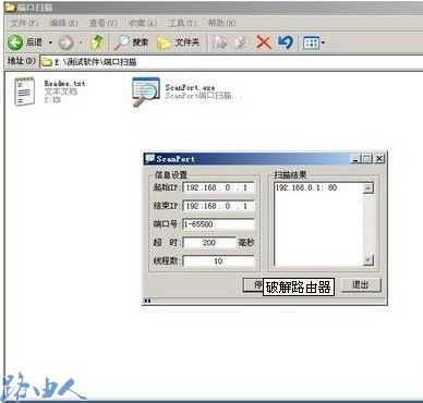 用端口扫瞄器ScanPort来扫瞄路由器所有的开放端口,在“开始”和“停止”处都填上路由器的IP地址192.168.0.1,将扫描端口设置为1-65350,设置完成后点击“开始”按钮,不一会就可以找到路由器的管理界面的登录端口,要测试端口是否正确,我们可以在IE地址栏中输入“http://192.168.1.1:端口号”进行查看,如果端口正确,将会出现路由器的登录界面。