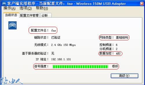 (5)要连接的无线网络是启用安全的无线网络,身份验证模式、数据加密、密钥必须保持和接入点的设置一致,才能保证连接上接入点以及正常通信;