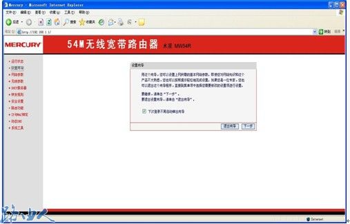(2)水星路由器管理界面,点击左侧的设置向导进行上网设置;