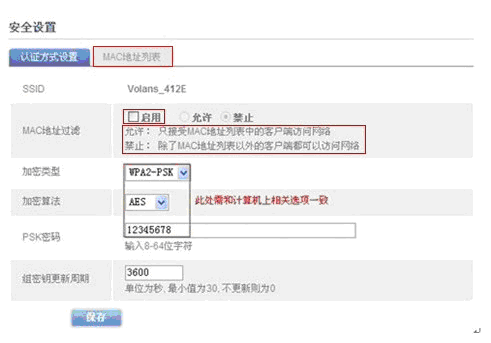 除了计算机上设置相应的加密方式以外,还需在飞鱼星无线路由器上设置加密。进飞鱼星无线路由器的配置界面,在无线设置—安全设置中选择相应的加密类型及加密算法。