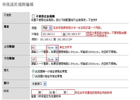 三、设置IP地址为192.168.0.2到192.168.0.57的计算机流量上行80KB和下行100KB的相关规则,即可