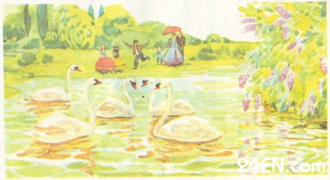 一天晚上,当太阳正在美丽的霞光中落下去的时候,有一群漂亮的大鸟从灌木林里飞出来,小鸭从来没有看到过这样美丽的东西。他们白得发亮,颈项又长又柔软。这就是天鹅。他们发出一种奇异的叫声,展开美丽的长翅膀,从寒冷的地带飞向温暖的国度,飞向不结冰的湖上去。