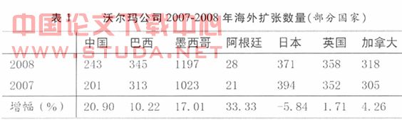 沃尔玛公司作为世界零售行业的领路者,其对外扩张一直为人所关注,我们来分析在危机背景下,沃尔玛在不同经济体国家的扩张策略。在表1中我们可以看到,尽管遭受金融危机的冲击,但是沃尔玛在中国、巴西、墨西哥以及阿根廷等新兴市场及发展中国家的扩张速度明显快于日本、英国以及加拿大等发达国家。而从沃尔玛2009年报公布的消息我们得知,在新的财年里公司准备在海外开550-600家新店,其中大部分店铺选择在新兴市场。