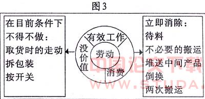 任何车间的劳动都可如图3一样划分,将现场劳动划分为“浪费”、“不增加价值的劳动”和“增加附加值的劳动”三部分组成。其中:增加附加值的有效劳动所占的比例较低,但只有它能改变形状、质量以及组装等某种形式的加工,也就是说,在制造零部件或产品时,对原材料或半产品等加工对象付出劳动,创造出附加值,即劳动增殖率。而没有附加值的工作和浪费占的比重较大,并且没有附加值的劳动也应视为浪费,因为它们没有提高或增加产品的附加值,只会增加人工成本,因此对属于浪费的劳动应立即消除,对不增加附加值的劳动,要合理安排、加以改进,尽量减少其比率,提高劳动附加值。