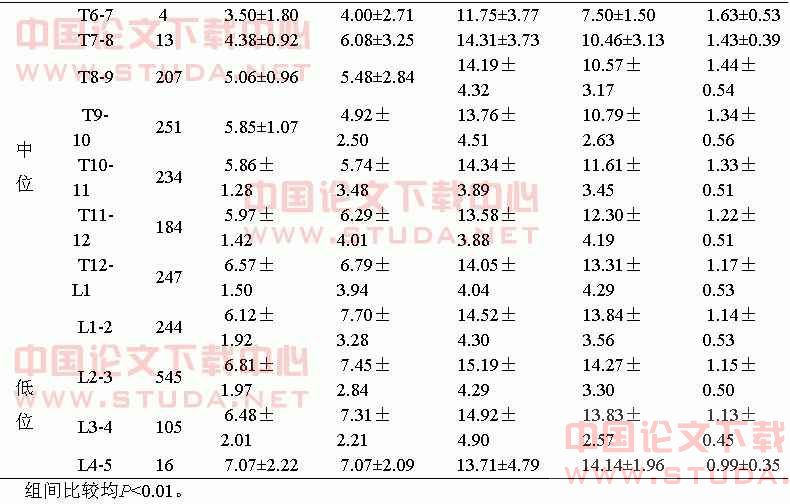 中位穿刺病例硬膜外阻滞时,初量和扩散范围少于低位穿刺病例,而前者D/S大于后者,分别为1.31±0.53 ml/节和1.14±0.50ml/节,均P<0.01。中位穿刺点病例向头和尾扩散约6个(分别为5.88±1.35和5.83±3.45)节段,两者无差别,P>0.05。低位穿刺点病例向头和向尾扩散达7个左右(分别为6.58±1.98和7.50±2.90)节段,前者少于后者1个节段,P<0.01(表1)。不同穿刺点初量、扩散节段、向头和向尾扩散节段组间均存在明显差异,P<0.01;扩散范围有随穿刺点下移呈现出增加、D/S减少趋势,尤其是中位穿刺病例(表2)。