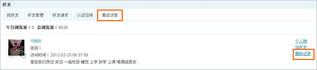 注:若好友空间主页有显示好友秀模块,也可以从好友秀模块上“最近访客”里删除您的访问记录。