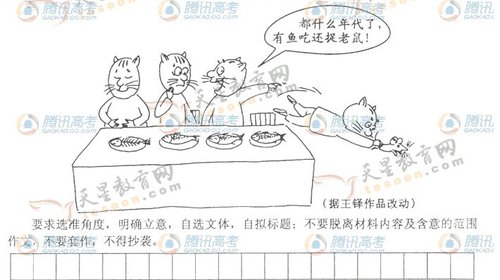 2010年普通高等学校招生考试全国卷1作文题。 漫画作文。餐桌,许多猫吃鱼,就一只猫捉老鼠,别的猫说:有...